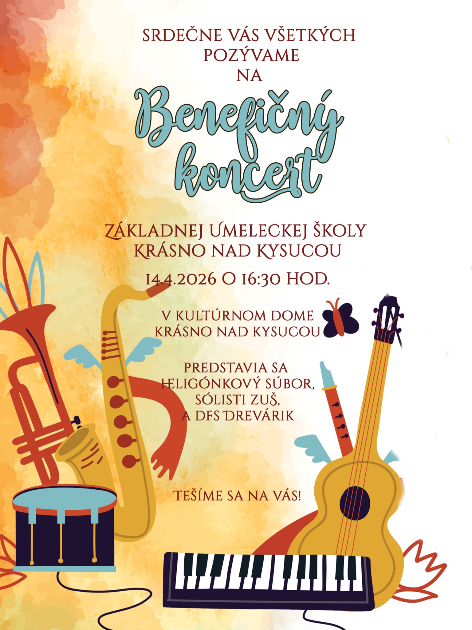 Základná umelecká škola v Krásne nad Kysucou srdečne pozýva všetkých milovníkov hudby, kultúry a dobrej atmosféry na benefičný koncert, ktorý sa uskutoční v utorok 14. apríla 2026 o 16:30 hod. v Kultúrnom dome v Krásne nad Kysucou.
