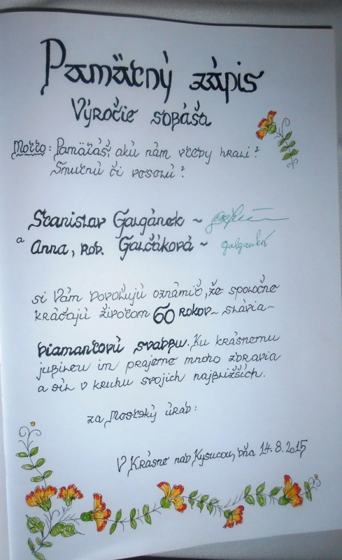 Krásne výročie spoločného života si pripomenuli naši spoluobčania Stanislav Galgánek a Anna, rod. Galčáková. Tento pár si v piatok 14.8.2015 pripomenuli 60 rokov spoločného života. Pred 60. rokmi začali svoju spoločnú životnú púť. K tomuto výročiu im zagratuloval primátor mesta Ing. Jozef Grapa. Pri tejto príležitosti si pripomenuli svadobné obrady a obnovili svadobné sľuby a zaspomínali na doterajší život a výchovu svojich detí. Spoločne s rodinou a priateľmi oslávili toto krásne jubileum, ku ktorému im primátor poprial mnoho zdravia, božieho požehnania a veľa pekných dní strávených v kruhu svojich najblizších.