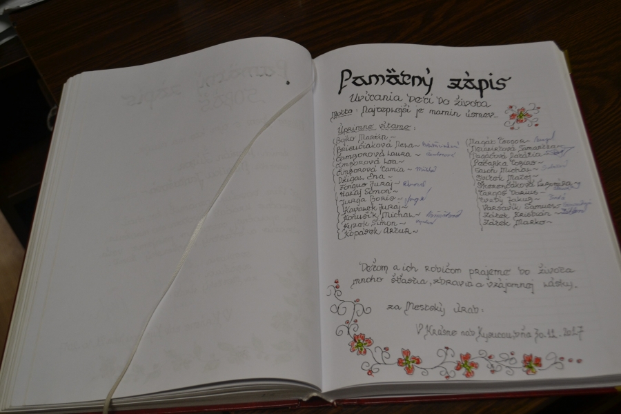 Posledný novembrový deň v tomto roku 2017 patril privítaniu najmenších obyvateľov nášho mesta. V počte 17 chlapcov a 8 dievčat, bolo pozvaných na uvítanie detí do života v Krásne nad Kysucou. Po úvodnom programe vystúpenia detí z Materskej školy Prvosienka sa prítomným prihovoril primátor mesta Jozef Grapa a privítal mamičky i drobcov na mestskom úrade. Vo svojom príhovore vyzdvihol úlohu rodiny "..dávajte im svoju rodičovskú lásku a starostlivosť tak, aby vaše šťastie bolo znásobené v budúcnosti jeho láskavým a starostlivým vzťahom voči Vám..", po príhovore matrikárka mesta Janka Ďuranová predstavila primátorovi všetky detičky. Primátor mamičkám odovzdal praktický darček a kvet ako poďakovanie za prínos pre mesto a nasledoval zápis do Pamätnej knihy.