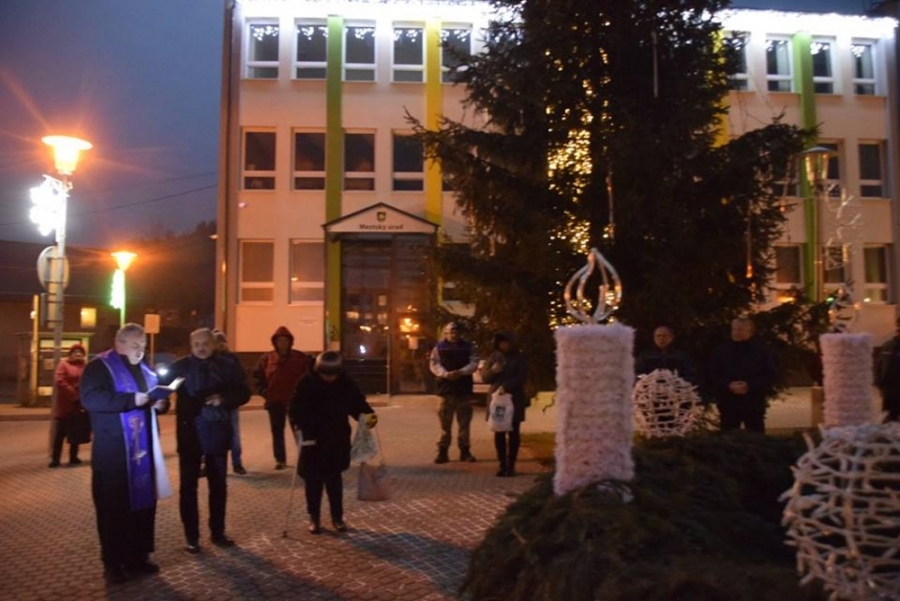 V sobotu večer sa v kostole posväcovali adventné vence a sviečky, ale tento špeciálny, prišiel pán dekan osobne požehnať na námestie. Primátor mesta Jozef Grapa pripomenul symboliku adventného venca a poďakoval všetkým zúčastneným pri zapálení prvej adventnej sviece, ktorá symbolizuje MIER.