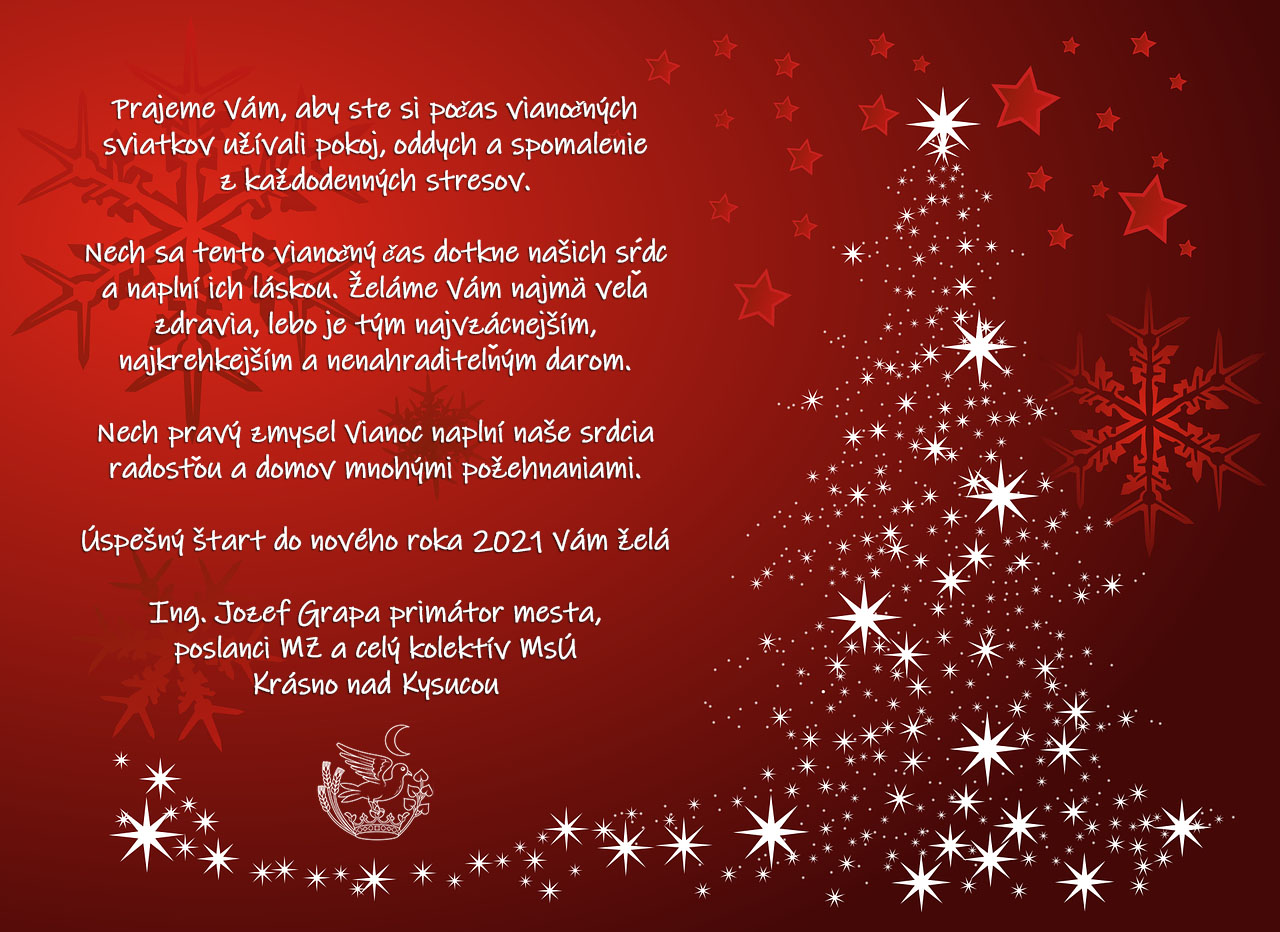 Prajeme Vám, aby ste si počas vianočných sviatkov užívali pokoj, oddych a spomalenie z každodenných stresov. Nech sa tento vianočný čas dotkne našich sŕdc a naplní ich láskou. Želáme Vám najmä veľa zdravia, lebo je tým najvzácnejším, najkrehkejším a nenahraditeľným darom.