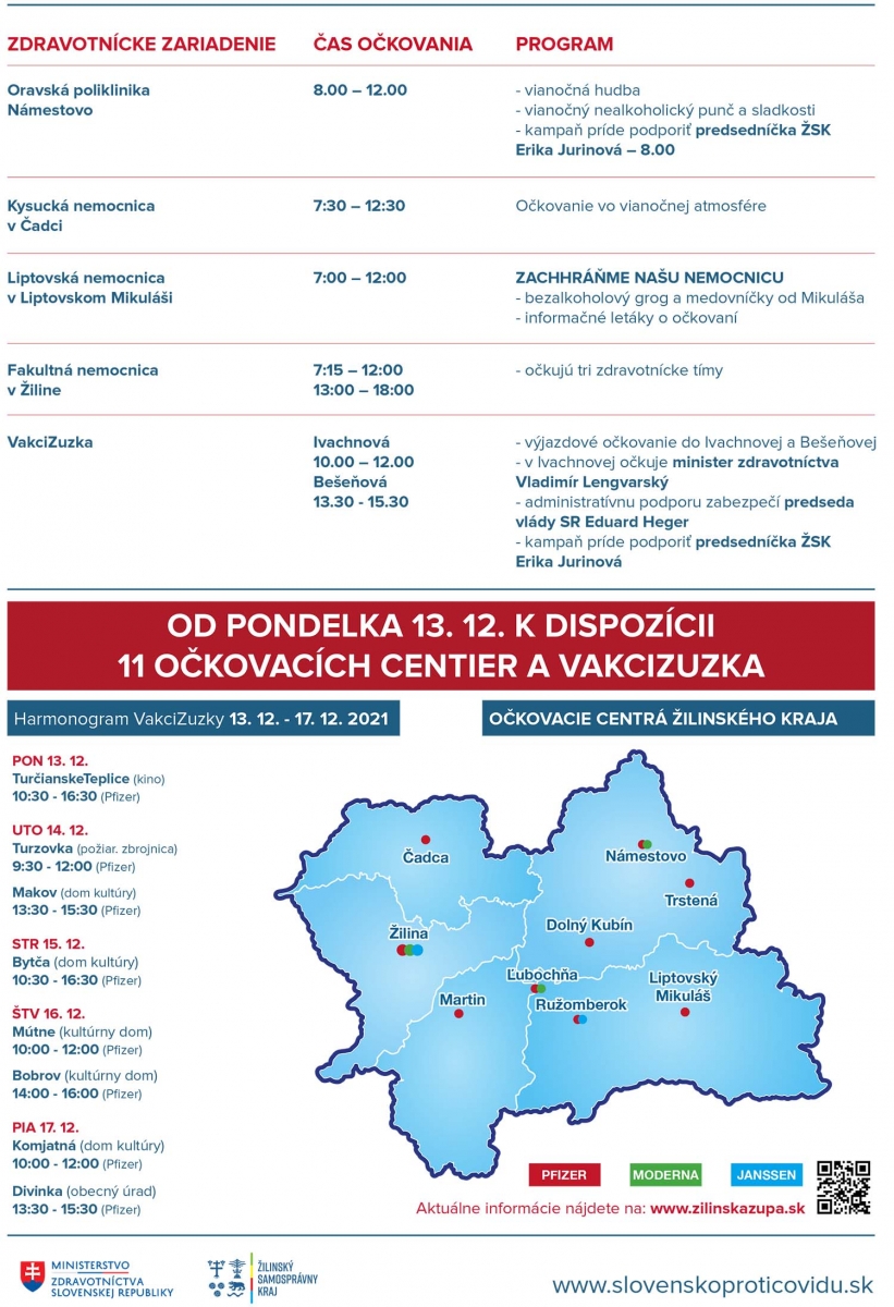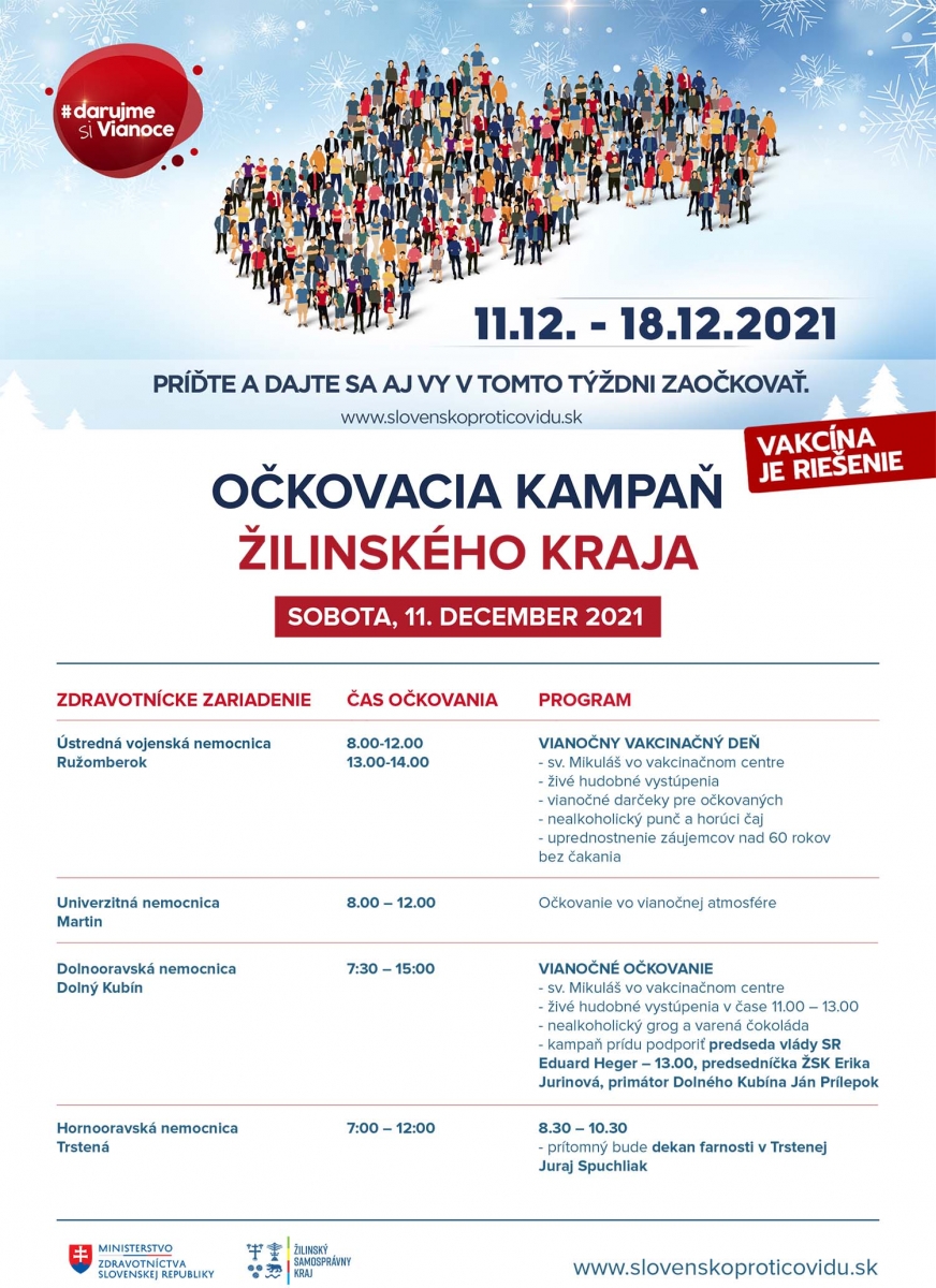 Zaočkovať sa môžete aj bez registrácie aj túto sobotu 11. decembra v očkovacích centrách v Čadci, Žiline, Martine, Trstenej, Námestove, Dolnom Kubíne, Ľubochni, Ružomberku a Liptovskom Mikuláši, alebo prostredníctvom VakciZuzky.