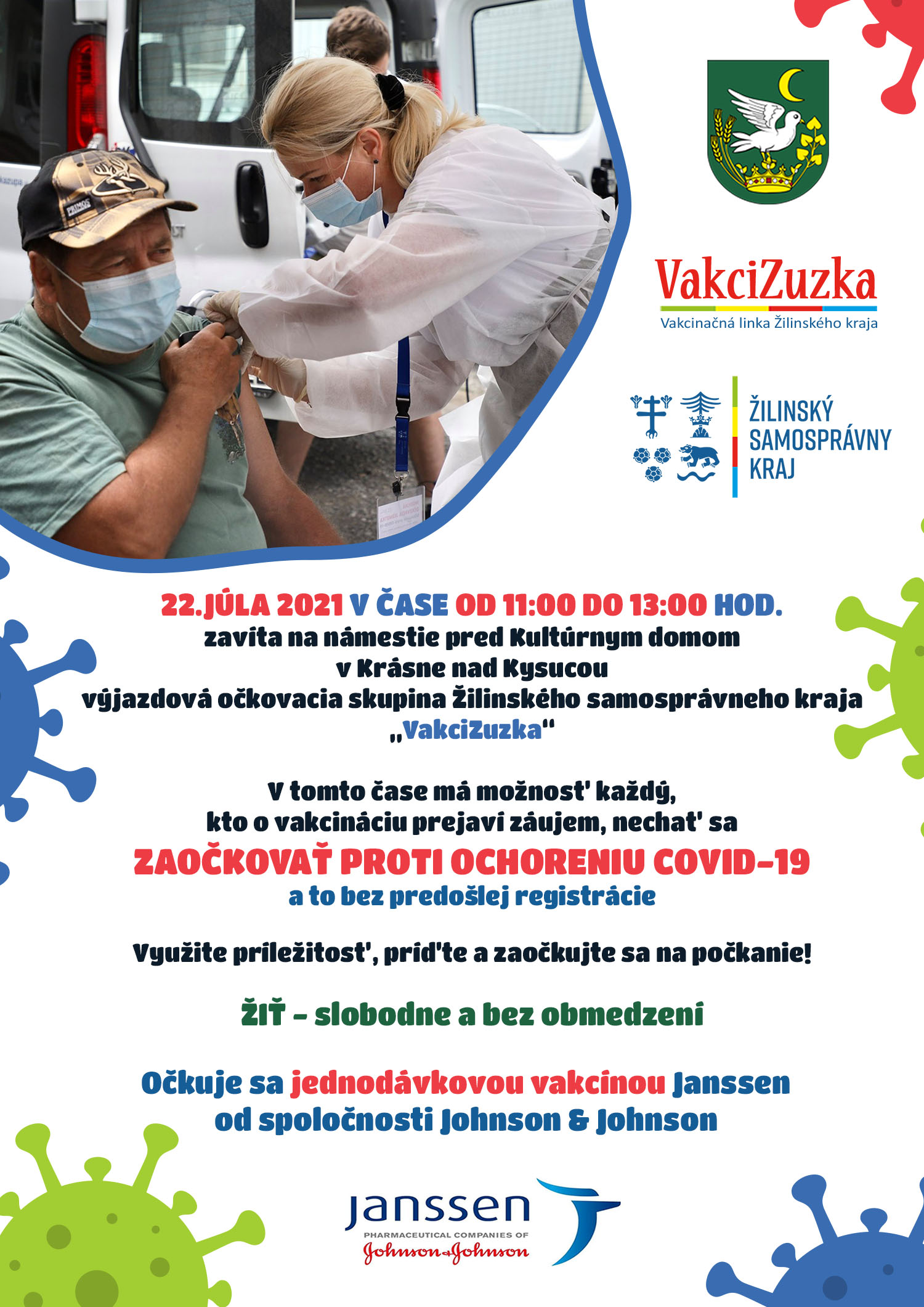 V záujme zabezpečiť bezproblémovú a maximálnu mieru zaočkovanosti všetkým občanom, ktorí majú záujem o očkovanie proti ochoreniu Covid -19, Žilinský samosprávny kraj spúšťa prevádzku výjazdovej očkovacej skupiny, ktorá bude k dispozícii v našom meste Krásno nad Kysucou dňa 22. 07. 2021 /štvrtok/ od 11.00 do 13.00 hod. pred Kultúrnym domom.