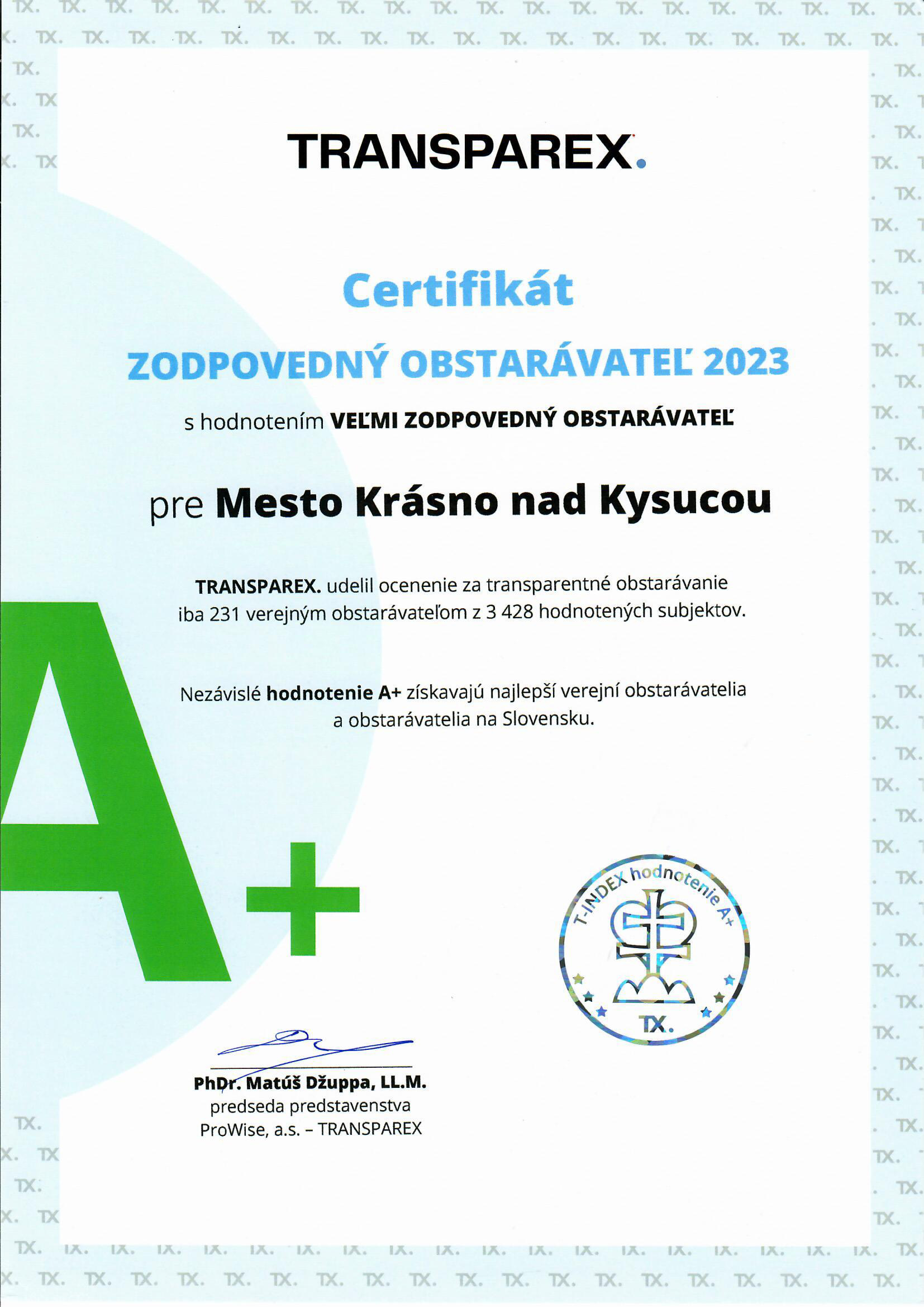 Našou snahou je čo najtransparentnejšie a najvýhodnejšie zaobstarať jednotlivých dodávateľov. Preto nás potešil certifikát, ktorý nám udelila organizácia TRANSPAREX za transparentné obstarávanie. Toto hodnotenie vydala len 231 verejným obstarávateľom z 3 428 hodnotených subjektov.