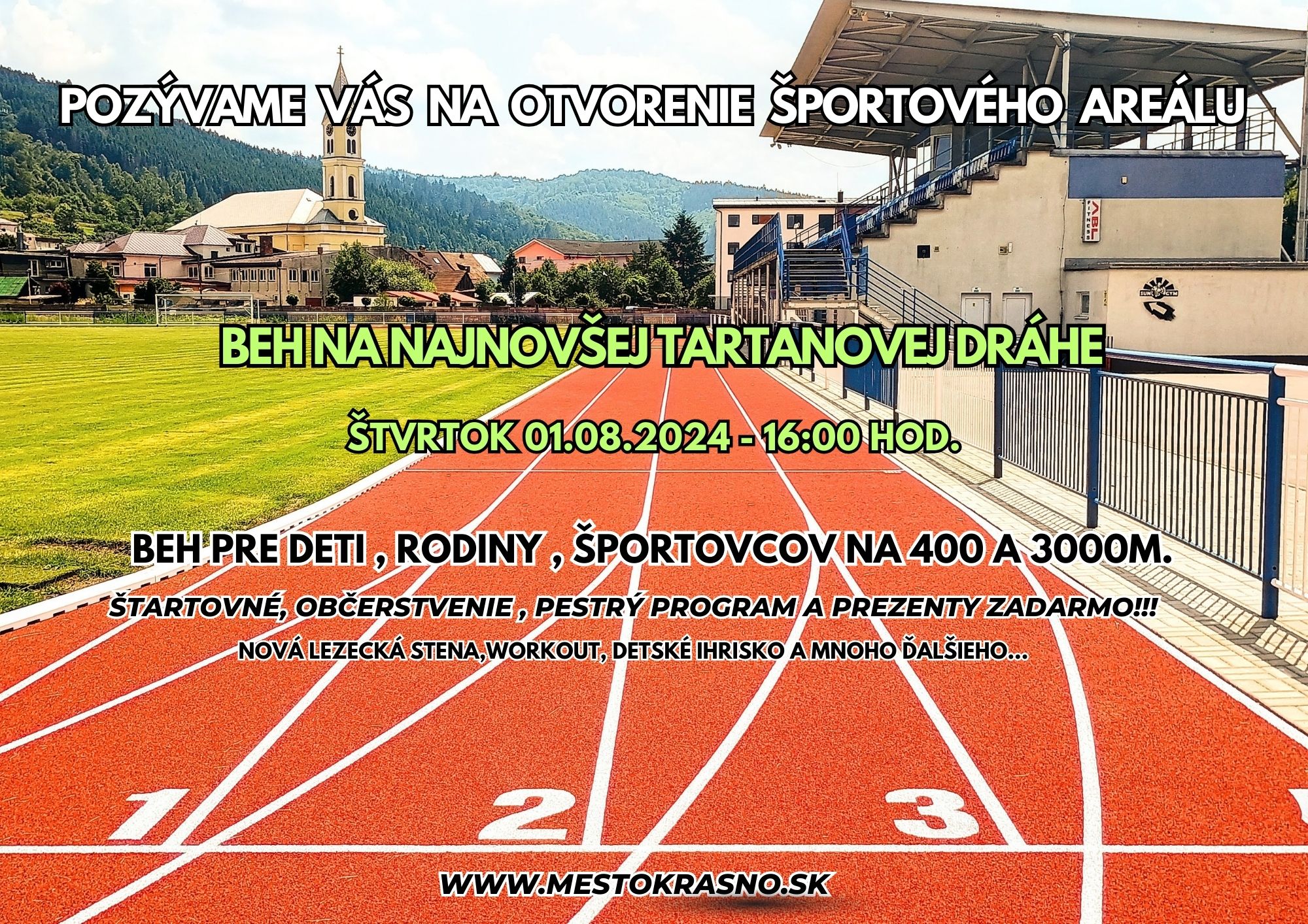 Srdečne Vás pozývame na slávnostné otvorenie tartanového oválu s ďalším príslušenstvom dňa 1. augusta 2024 o 16.00hod, ktorý sa nachádza v športovom areáli TJ Tatran. Čaká Vás beh pre deti, pre rodiny, o 17.00hod. štart beh na 400m, o 17.30hod beh na 3000m na novej tartanovej dráhe.