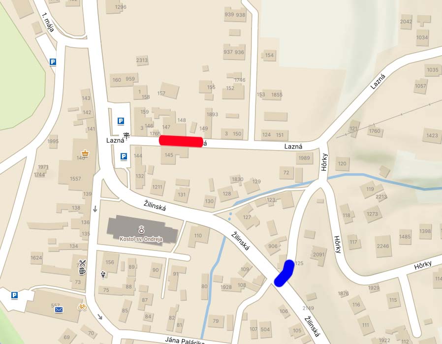 Oznamujeme občanom, že z dôvodu stavebných prác bude v stredu 10.4.2024 v čase od 12:00 do 16:00 ulica Lazná pri dome č. 148 (nad parkoviskom pri kostole) uzatvorená (na mape označená červenou farbou). Prejazd je možný od Žilinskej cesty smerom na Hôrky (na mape vyznačená modrou farbou). Ďakujeme za pochopenie.