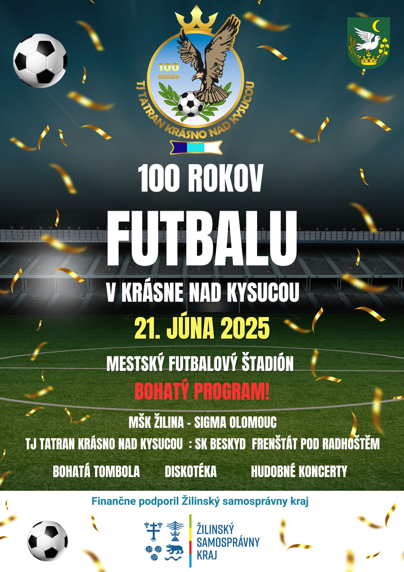 Futbalový klub TJ Tatran Krásno nad Kysucou a mesto Krásno nad Kysucou Vás srdečne pozývajú na slávnostný program pri príležitosti 100. výročia futbalu v Krásne nad Kysucou, ktoré si spoločne pripomenieme v sobotu 21. júna 2025 na Mestskom futbalovom štadióne.