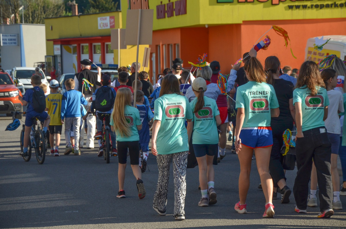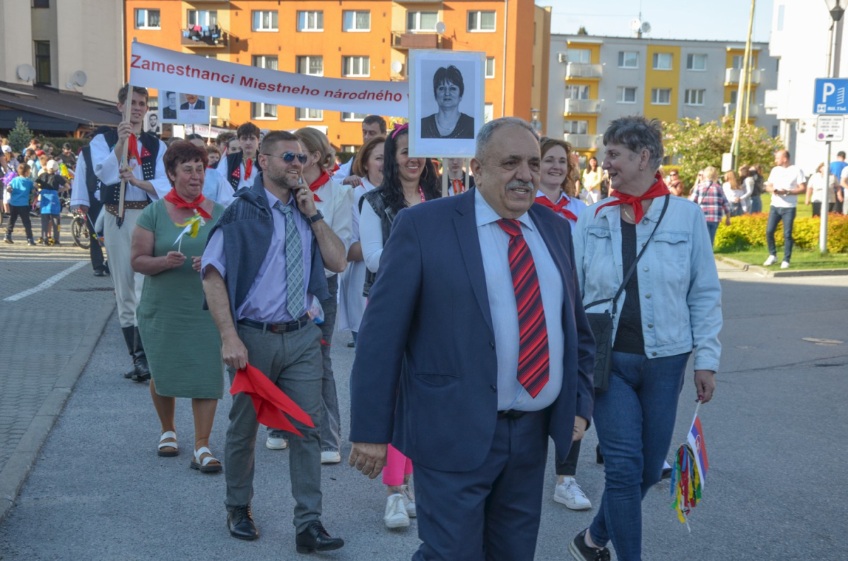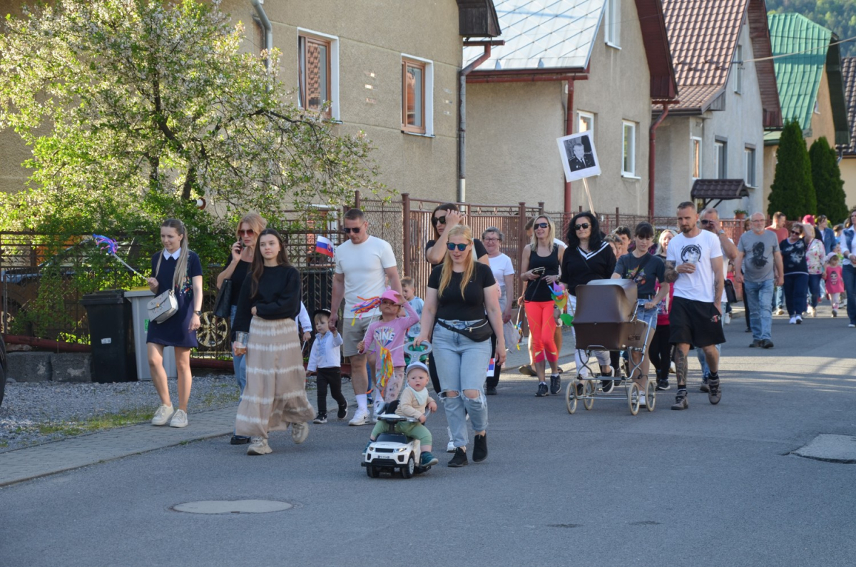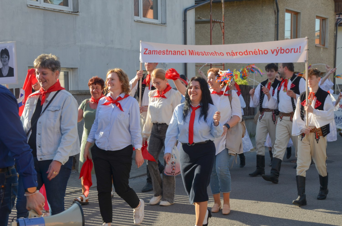 Pionierské šatky, pestrofarebné mávatká a holubice mieru nechýbali na humornom prvomájovom sprievode 30. apríla 2025 v meste Krásno nad Kysucou.