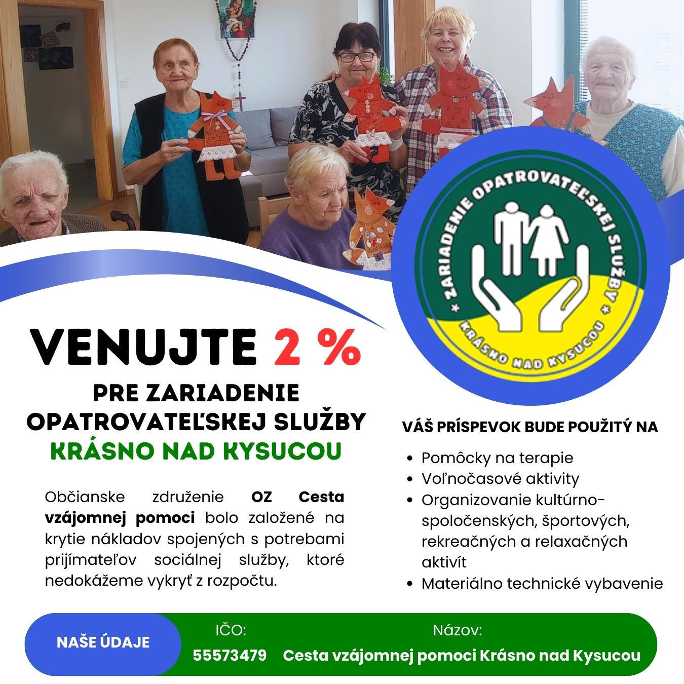 Milí spoluobčania, milí priatelia, dovoľte nám touto cestou obrátiť sa na Vás zo žiadosťou o darovanie 2% alebo 3% z dane pre Zariadenie opatrovateľskej služby Krásno nad Kysucou.